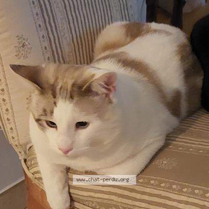 Chat d'extérieur qui connaît bien le coin et vit en campagne. Il a l'habitude de s'absenter quelques heures mais jamais plus. Très affectueux.