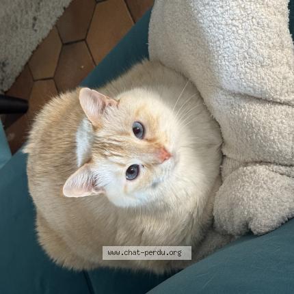 Chat blanc avec reflets roux (origine siamoise). Yeux bleus. Gros. Boulimique.