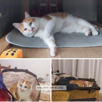Il est roux et blanc, âgé de 2 ans et demi. C'est un beau matou qui adore manger mais qui peut être un peu craintif quand il ne connait pas, après il est très sociable. Il n'aime pas se laisser porter.