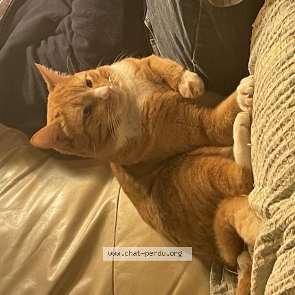 Chat roux de 2 ans. Câlin et joueur. N’est pas rentré de sa promenade du soir au fond du jardin. Habitué à vivre et dormir à l’intérieur