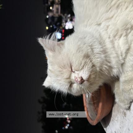 I found a white persian male cat which was sitting on the stairs of our building when i send the photo in our building group i found out that it wasnt a cat of any of the people there, it has been trimmed i think for summer heat and is a big male cat